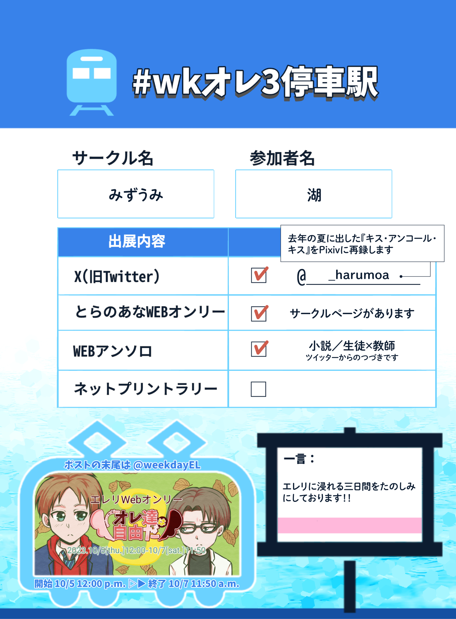 info あすのwebイベントについてです。 Pixivに去年出した本の再録 をするのと、webアンソロ があります! とらのあなwebオンリーサークルページ よかったら見にきてください🎶 追記 webアンソロはこちらのつづきです 2023/10/05
